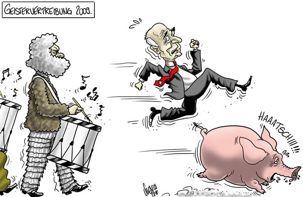 In vielen Regionen der Schweiz werden zur Zeit die Geister des alten Jahres vertrieben. So zum Beispiel in Meiringen mit dem traditionellen Ubersitz, an dem mit Tricheln und Schellen verkleidete Gruppen mehrere Tage und Naechte durch die Strassen ziehen. Wenn wir Glueck haben, schaffen sie es, dass 2010 nur 11 Monate hat, ... ohne Merz.