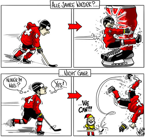 Einmal mehr schafften die Schweizer an er Eishockey-WM den Einzug ins Halbfinale nicht, trotz auf dem Papier schwaecherem Gegner. Resultat: Schweiz 4 Pfostentreffer, 0 Tore - Deutschland 1 Tor. Allerdings spielte die Schweiz unter ihrem neuen Trainer Simpson eine ueberraschend gute WM, trotz Absagen von 21 Spielern. Vielleicht klappts ja naechstes Jahr mit der ersten Medaille seit 1953!