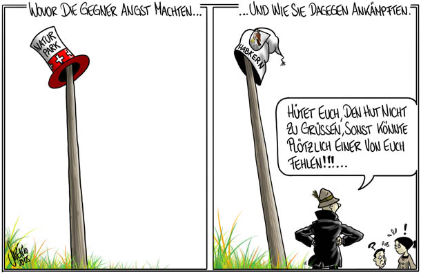 Es ging nur darum, ob sich die Gemeinde Habkern einem nationalen Naturpark anschliessen soll, also etwas mehr sanfter Tourismus mit Geld vom Staat. Doch die Mittel die die Gegner einsetzten - vor allem Jaeger und Bauern die Angst haben vor massiven Regulierungen des Staates - waren heftigste Einschuechterungen.