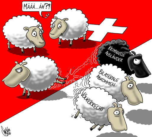 In einem Monat muessen wir wieder einmal ueber eine fremdenfeindliche Initiative der SVP abstimmen, die gegen verschiendenste Grundrechte der Menschheit verstoesst. Die Ausschaffungsinitiative, welche kriminelle Auslaender nach einer Straftat, egal welcher Art, sofort aus dem Land schmeisst.
