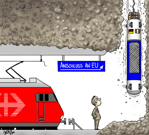 Durchbruch im 57 km langen Gotthardbasistunnel. Die Schweiz legt die "Autobahn" fuer Zuege durch die Alpen. Bloss was nutzts wenn die EU-Anschluesse nicht stehen? Vielleicht brauchts dann Rettungskapseln wie in Chile...