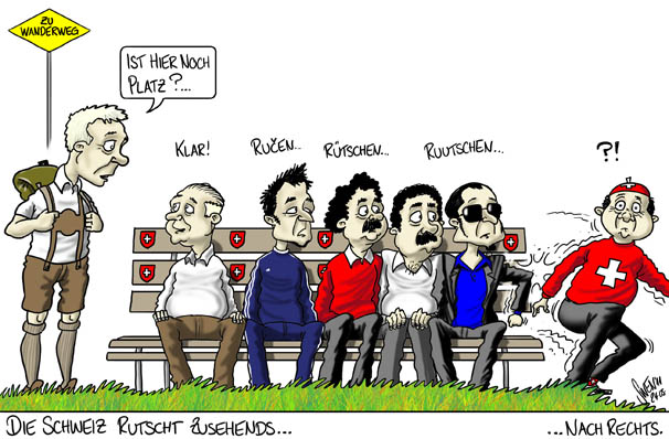 Wieviel Zuwanderung ertraegt die Schweiz? Die SVP startet (natuerlich rechtzeitig zum Wahlkampf) eine Initiative zur Beschraenkung der Zuwanderung. Schweizerinnen und Schweizer fuehlen sich durch Auslaender zusehends bedroht, die Politik hilft ihr dabei nicht im geringsten. Ein gefundenes Fressen fuer Blochers Partei.