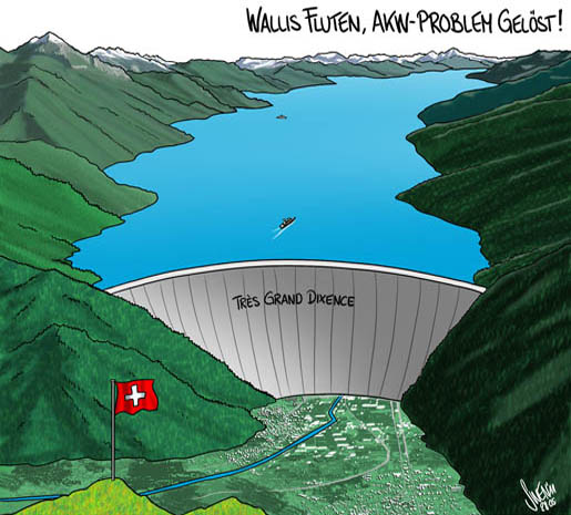 Wieviel Ersatzkraftwerke braucht es, um die AKW's zu ersetzen? Forscher gehen von an die 40 neuen Stausseen hauptsaechlich bei Gletschern im Wallis aus. Eine einzige Mauer waere da einfacher, mit einem anstaendigen Schiffsverkehr auf dem neuen Lac de Fendant direkt in die Skigebiete fuer die Uesserschwiizer und andere Touristen.