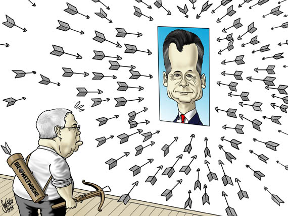 Duell Blocher gegen Hildebrand. Notenbankchef Hildebrand wird des Insidergeschaeftes verdaechtigt. Einmal mehr versucht Blocher Hildebrand abzuschiessen und scheitert. Mehr dazu: Tagi