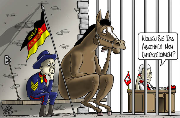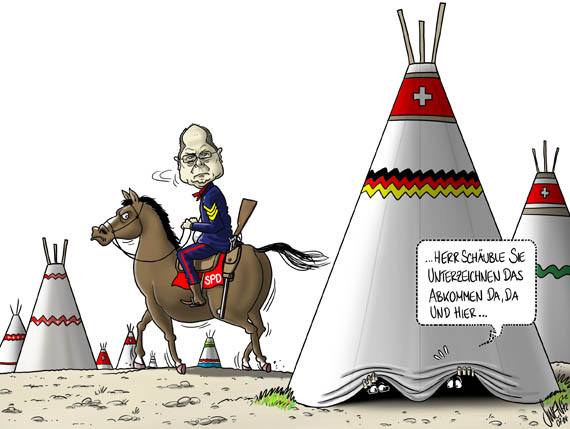 Das Steuerabkommen zwischen der Schweiz und Deutschland ist unterschrieben, jedoch wird es vielleicht nicht sehr alt. Die SPD Deutschlands wird alles tun, dass der Deutsche Bundesrat das Abkommen nicht annimmt. An der Spitze der Kavallerie steht neben Parteichef Gabriel und der sich im Wahlkampf befindenden Hannelore Kraft unser aller Schweizer Liebling: Der Steinbrueck Peer aus Hammburch...