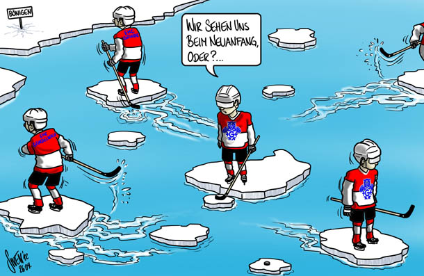 Nach den Fussballvereinen triffts nun auch die Eishockeyclubs: Der NLA-Club Kloten Flyers steht vor dem Konkurs und im Berner Oberland verschwindet ein Traditionsverein aus frueheren Zeiten in der Versenkung. Der ehemalige B-Club Grindelwald. Jungfrau Zeitung