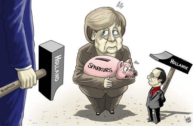 Die buergerliche Regierung in Holland ist gescheitert und Frankreich erhaelt wahrscheinlich den Sozialisten Hollande als Praesidenten. Angela Merkel verliert wohl sehr wichtige Partner fuer ihren eisernen EU-Sparkurs und steht vielleicht bald alleine da.