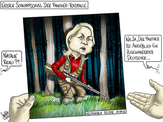 Angeblich streift ein Panther durch das Mittelland, viele Leute bestaetigen sie haetten ihn gesehen. Fotos oder Spuren hingegen fehlen. Auch in Sueddeutschland soll ein Panther seit laengerem unterwegs sein. Vielleicht ist es ja der Gleiche. Neues Futter also fuer die SVP die gegen die Zuwanderung aus Deutschland Stimmung macht.