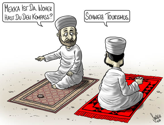 Schweiz Tourismus versucht mehr Gaeste aus muslimischen Laendern anzulocken. Dabei versucht man auch auf ihre Religion Ruecksicht zu nehmen und bietet Halal-Essen an, Gebetsteppiche mit Kompass usw., usf.