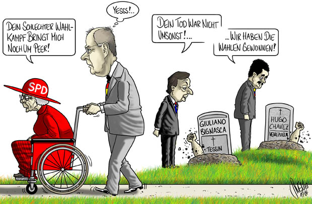 In Venezuela gewinnt Maduro die Wahlen, der Wunschnachfolger des verstorbenen Hugo Chavez. Im Tessin gewinnt die rechte LEGA mit Borradori, Wunschnachfolger des verstorbenen Bignasca. Derweil sind die Umfragewerte des SPD-Kanzlerkandidaten Steinbrueck in Deutschland im Keller, aber das will noch nix heissen...