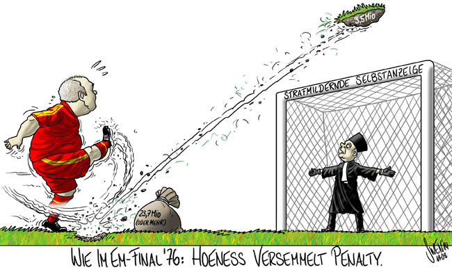 Prozess gegen FC Bayern Praesident Hoeness. Er zeigte sich selber an und nannte den Betrag von 3,5 Millionen die er an Steuern hinterzogen hatte, diese Selbstanzeige waere strafmildernd gewesen. Doch schon zu Beginn der Verhandlung gab Hoeness bekannt der Betrag sei viel hoeher, erst 15 Millionen, dann 23,7 Millionen, aktuell 27,2 Millionen... die Gefaengniszelle duerfte jedenfalls schon hergerichtet sein.