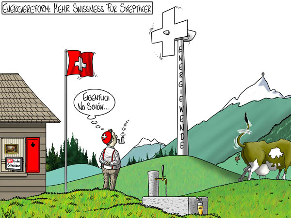 Swissness überall. Der Bundesrat will Trinkwasser nicht als Schweizer Rohstoff zur Swissness-Berechnung zulassen, sondern bloss Quell- und Mineralwasser. Viele kleine Schweizer Brauereien stellen ihr Bier aber mit normalem Trinkwasser her. Swissness auch im TV, wer SRF schaut wird zugedröhnt mit der Landesidylle. Das nervt nun auch den Unterhaltungschef des Senders. Doch vielleicht könnte man ja mit mehr swissness die konservativen Politiker von der Energiewende überzeugen. Diese Woche beginnt im Parlament die Monsterdebatte zur Energiereform.