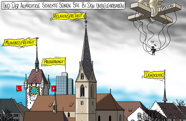 Der türkische Ministerpräsident Davutoglu besuchte in Baden eine Privatveranstaltung, welche die Steuerzahler um die 50'000.-- kostet! Wie gesagt, privat! Nicht von offizieller Seite eingeladen. Aber der Polizeiaufwand zum Peronenschutz muss vom Steuerzahler finanziert werden. Dafür machte er auch klar wofür er steht, nämlich hauptsächlich hinter den Ansichten des streitbaren Präsidenten Erdogan, der seine eigenen Versionen betreffend Demokratie und Freiheit pflegt.