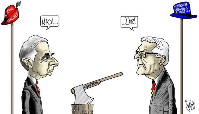 Deutschlands Aussenminister Steinmeier besuchte die Schweiz. Er glaubt daran, dass die Verhandlungen zwischen der Schweiz und der EU zu einem Ergebnis kommen werden. Allerdings ist auch für ihn wie für die EU die Personenfreizügigkeit unantastbar. Und genau da liegt ja der Haken an der ganzen Masseneinwanderungsinitiative, welche die Schweiz knapp annahm.