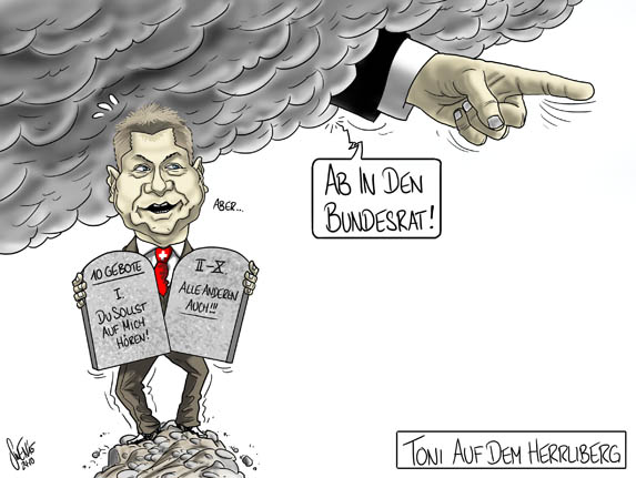 Die SVP sucht nach möglichen Bundesratskandidaten. Darunter auch Parteichef Toni Brunner, grosser Favorit von Parteistratege, Übervater und Urgestein Blocher der im Hintergrund die Partei nach wie vor von seinem Wohnort Herrliberg aus lenkt und für den Toni fast wie ein zweiter Sohn ist. Brunner hingegen will nicht... bisher...
