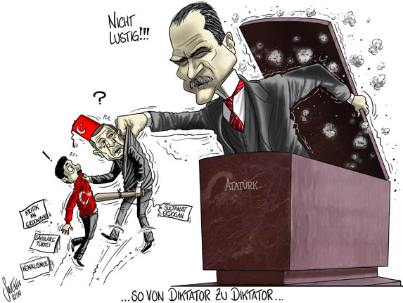Wenn das Atatürk wüsste, was Erdogan mit der Türkei anstellt. Atatürk war zwar ein Diktator, der aber aus dem ehemaligen Osmanischen Reich, welches islamisch konservativ war, den neuen säkulären Staat Türkei mit Anlehnung an westliche Wert machte. Natürlich ohne die Erlaubnis der Kritik am Regime Atatürk. Erdogan baut diese Türkei nun um, zurück zu einem konservativ-islamischen Staat und natürlich auch mit Personenkult rund um ihn. Atatürk jedenfalls hätte einem Erdogan den Prozess gemacht und ihn entweder ausgeschafft oder ins Verliess geschmissen.