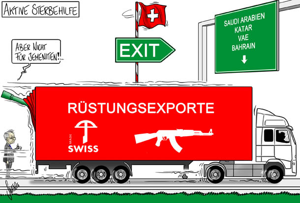 Der Bundesrat lockert die Waffenxporte in Staaten wie Bahrain, Katar, Saudi Arabien etc.... ausser Jemen, denn da herrscht ja Krieg.