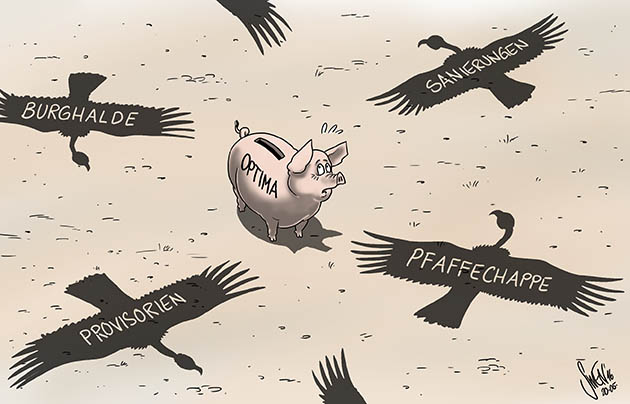 Die Stadt Baden hat ein Sparpaket geschnürt, genannt Optima. Doch nun kommen grosse Investitionen auf die Stadt zu, die Schulhäuser der Oberstufe (Burghalde, Pfaffechappe) sind sanierungsbedürftig und sollen teils Neubauten weichen.