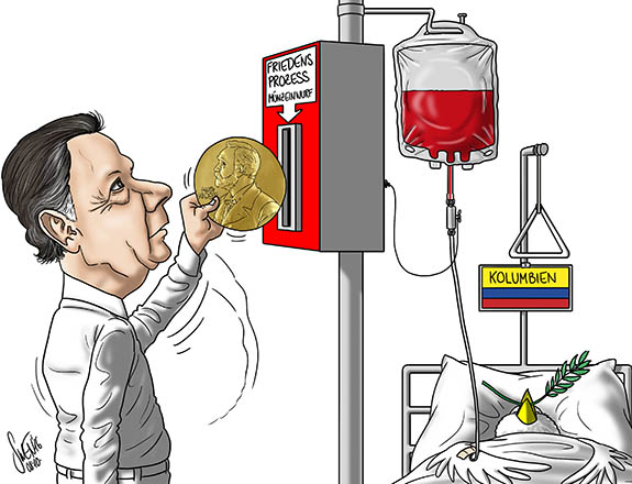 Der Friedensnobelpreis geht an den Kolumbianischen Präsidenten Juan Manuel Santos für sein Friedensabkommen mit den FARC-Rebellen, welches das Volk allerdings in einer Abstimmung knapp ablehnte. Santos will den Frieden dennoch sichern. Die Gegner scheinen ihn nun zu unterstützen und der Friedensnobelpreis hilft dabei nicht unwesentlich.