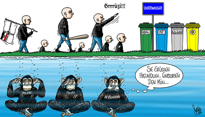 Neonazis-Konzert in Unterwasser (SG). Die Behörden ahnten nicht was da auf sie zukommt, die Polizei besuchte den Anlass und unternahm nichts, auch um die Stimmung nicht anzuheizen (es war auch als Privatanlass deklariert, wodurch der Polizei die Hände gebunden waren) und die Bevölkerung schaute weg. Viele Onlinekommentare lobten sogar wie die Neonazis nett grüssten und den Müll entsorgten und sogar die kleinsten "Fetzelchen" auflasen und wegwarfen.