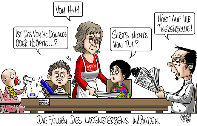 Und weiter gehts mit dem Ladensterben in Baden. Auto Bauer und der Möbelhändler "in!baden" verschwinden, Lebensmittelgeschäfte findet man nur noch (mit 2-3 Ausnahmen) die üblichen Grossen. Dafür hats mehr Platz für internationale Kleidergeschäfte oder Reisebüros. In den Mietinseraten steht jewils auch explizit: "Keine Gastronomie". Die Immobilienhaie wollen einfach nur Kohle, Kohle, Kohle um jeden Preis!