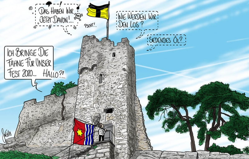 Zur 200 Jahrfeier der Gemeinde Ennetbaden (Damals loeste sich die Ennetbaden von Baden ab, quasi ein Ennetbexit), hiesste die Stadt Baden auf ihrer Burgruine die Flagge des Nachbarn. Dummerweise feiert der eher etwas schwierige und eigenbroedlerische grosse Nachbar Wettingen 2020 auch in groesserem Stil...